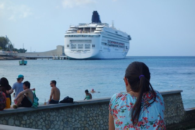 Fim de tarde na praia e Camille contemplando nosso cruzeiro, Norwegian Spirit