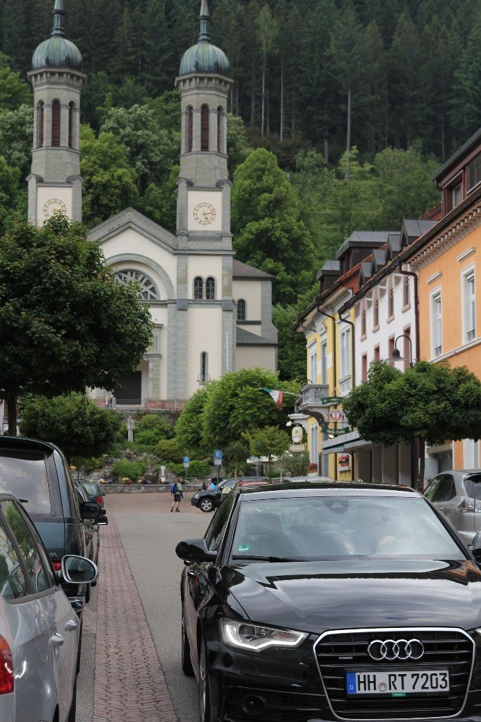 Flavio, o carro e a Igreja Batista St. John na ruazinha principal de Todtnau.
